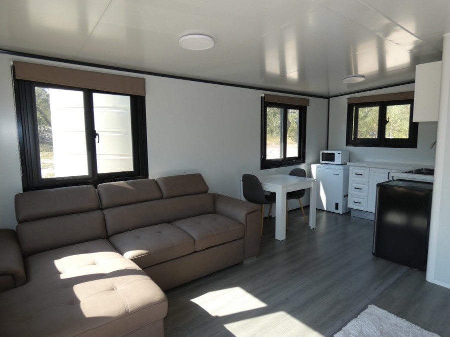 Powered by solar, the home features an open plan kitchen, dining and lounge area.  The bedroom is large enough to include a small office if desired, and the bathroom and toilet are combined.  Starlink internet is connected, hot water is gas, and total rainwater storage is approximately 6,490 gallons (29,500 litres).